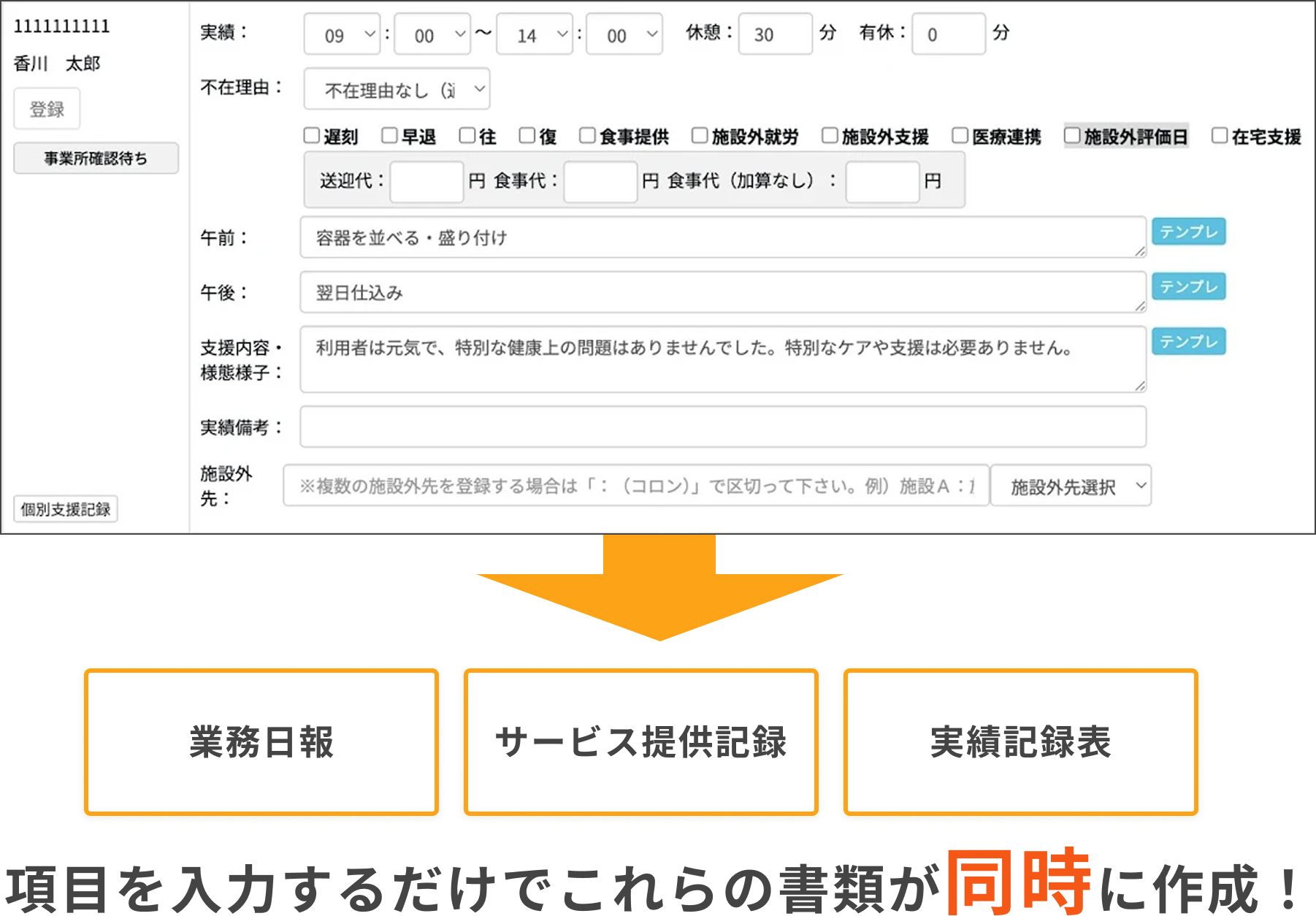 実績記録表・サービス提供記録が同時に作成できるため、かかる時間が1/3に削減可能!
